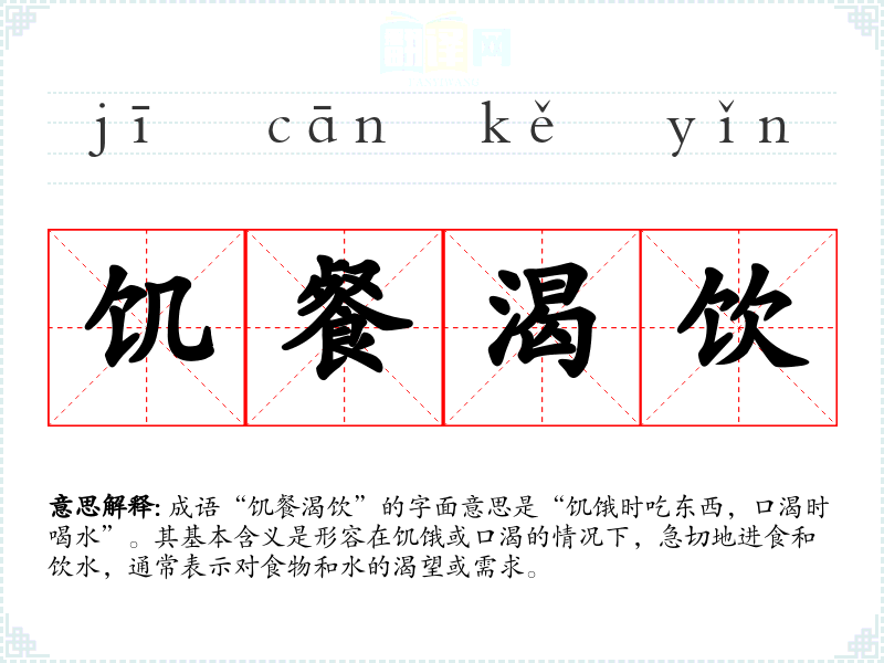 成语“饥餐渴饮”的字面意思是“饥饿时吃东西,口渴时喝水”。其基本含义是形容在饥饿或口渴的情况下,急切地进食和饮水,通常表示对食物和水的渴望或需求。