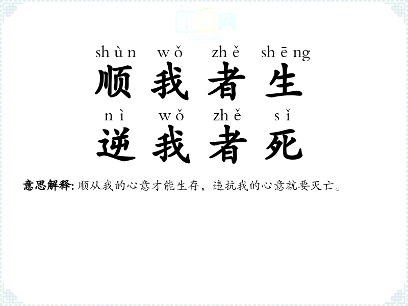 顺:顺从;昌:昌盛;逆:违背;亡:灭亡。顺从他的就可以存在和发展,违抗他的就叫你灭亡。形容剥削阶级的独裁统治。 |