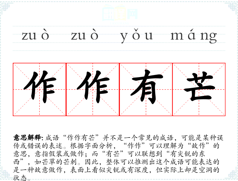 成语“作作有芒”并不是一个常见的成语,可能是某种误传或错误的表述。根据字面分析,“作作”可以理解为“故作”的意思,意指假装或做作;而“有芒”可以联想到“有尖锐的东西”,如芒草的芒刺。因此,整体可以推测出这个成语可能表达的是一种故意做作,表面上看似尖锐或有深度,但实际上却是空洞的状态。