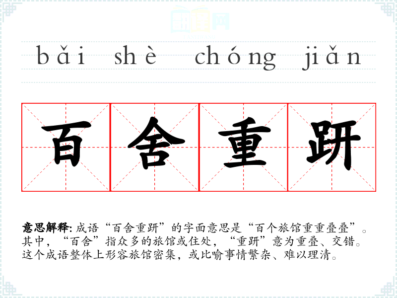 成语“百舍重趼”的字面意思是“百个旅馆重重叠叠”。其中,“百舍”指众多的旅馆或住处,“重趼”意为重叠、交错。这个成语整体上形容旅馆密集,或比喻事情繁杂、难以理清。