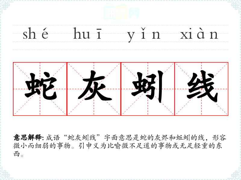 成语“蛇灰蚓线”字面意思是蛇的灰烬和蚯蚓的线,形容微小而细弱的事物。引申义为比喻微不足道的事物或无足轻重的东西。