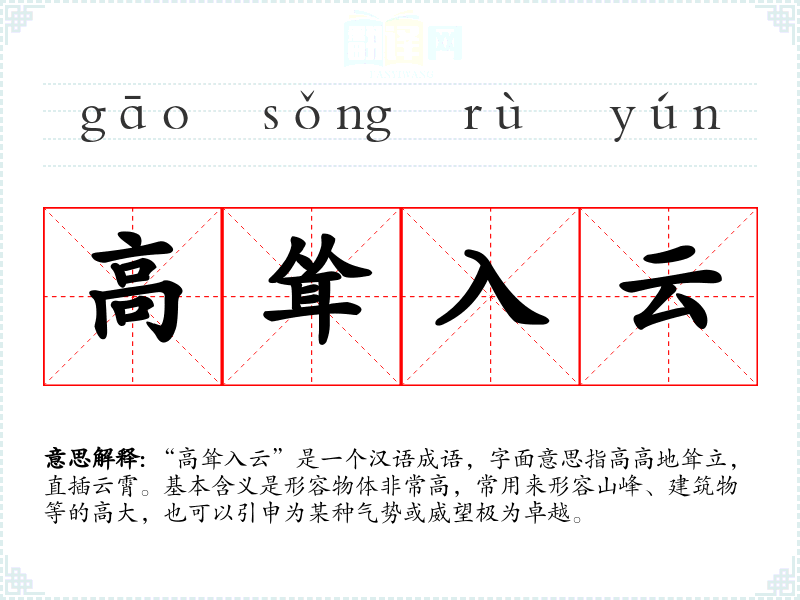 “高耸入云”是一个汉语成语,字面意思指高高地耸立,直插云霄。基本含义是形容物体非常高,常用来形容山峰、建筑物等的高大,也可以引申为某种气势或威望极为卓越。