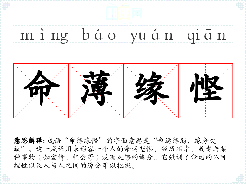 成语“命缘悭”的字面意思是“命运弱,缘分欠缺”。这一成语用来形容一个人的命运悲惨,经历不幸,或者与某种事物(如爱情、机会等)没有足够的缘分。它强调了命运的不可控性以及人与人之间的缘分难以把握。