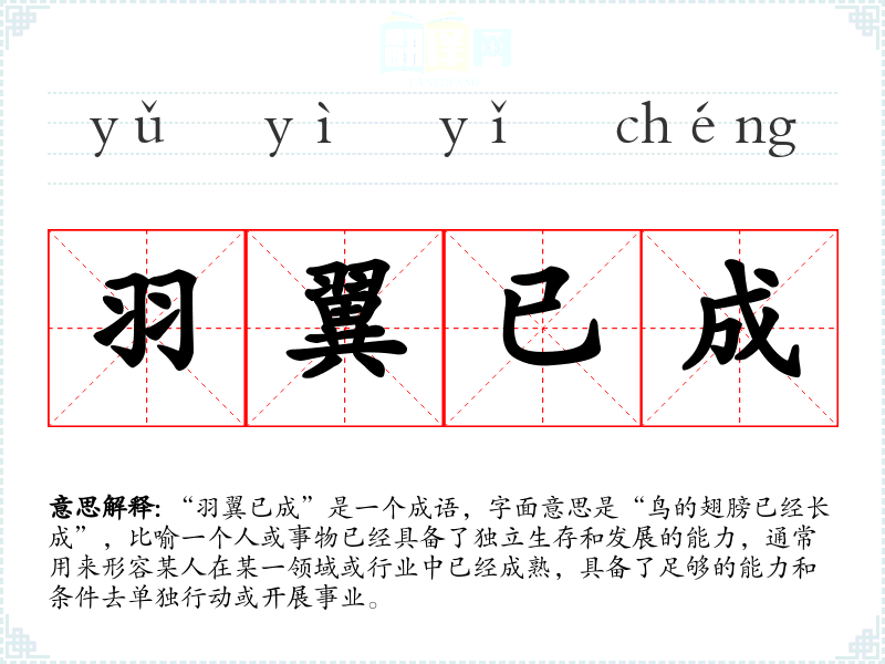 “羽翼已成”是一个成语,字面意思是“鸟的翅膀已经长成”,比喻一个人或事物已经具备了独立生存和发展的能力,通常用来形容某人在某一领域或行业中已经成熟,具备了足够的能力和条件去单独行动或开展事业。