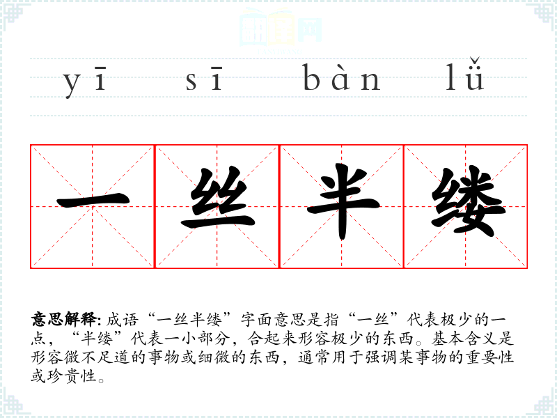 成语“一丝半缕”字面意思是指“一丝”代表极少的一点,“半缕”代表一小部分,合起来形容极少的东西。基本含义是形容微不足道的事物或细微的东西,通常用于强调某事物的重要性或珍贵性。