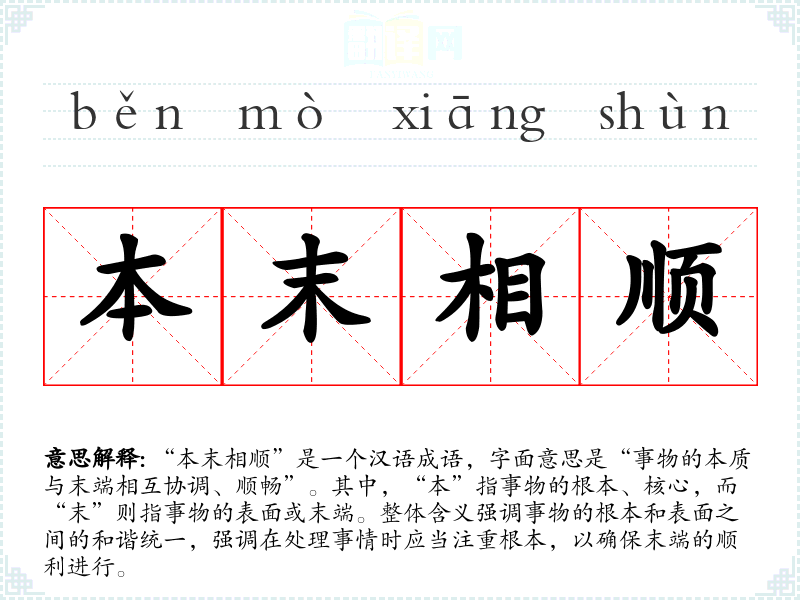 “本末相顺”是一个汉语成语,字面意思是“事物的本质与末端相互协调、顺畅”。其中,“本”指事物的根本、核心,而“末”则指事物的表面或末端。整体含义强调事物的根本和表面之间的和谐统一,强调在处理事情时应当注重根本,以确保末端的顺利进行。