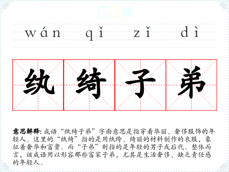 成语“纨绮子弟”字面意思是指穿着华丽、奢侈服饰的年轻人。这里的“纨绮”指的是用纨绔、绮丽的材料制作的衣服,象征着奢华和富贵。而“子弟”则指的是年轻的男子或后代。整体而言,该成语用以形容那些富家子弟,尤其是生活奢侈、缺乏责任感的年轻人。