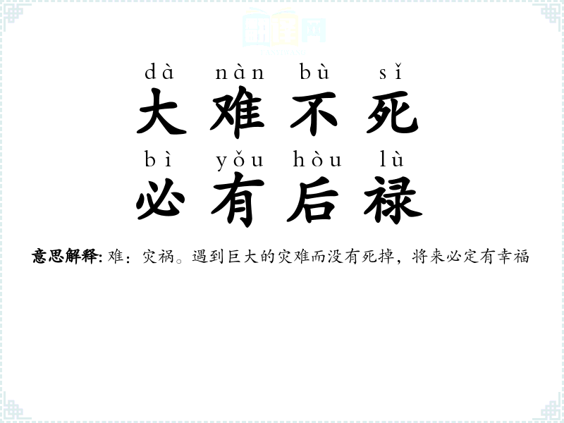 难:灾祸。遇到巨大的灾难而没有死掉,将来必定有幸福 |