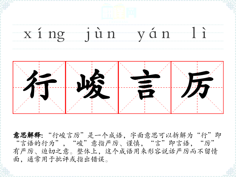 “行峻言厉”是一个成语,字面意思可以拆解为“行”即“言语的行为”,“峻”意指严厉、谨慎,“言”即言语,“厉”有严厉、迫切之意。整体上,这个成语用来形容说话严厉而不留情面,通常用于批评或指出错误。