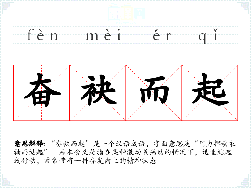 “奋袂而起”是一个汉语成语,字面意思是“用力挥动衣袖而站起”。基本含义是指在某种激动或感动的情况下,迅速站起或行动,常常带有一种奋发向上的精神状态。