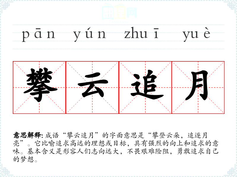 成语“攀云追月”的字面意思是“攀登云朵,追逐月亮”。它比喻追求高远的理想或目标,具有强烈的向上和追求的意味。基本含义是形容人们志向远大,不畏艰难险阻,勇敢追求自己的梦想。