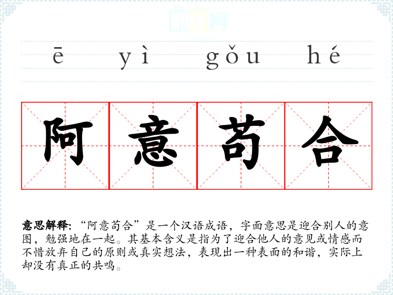 “阿意苟合”是一个汉语成语,字面意思是迎合别人的意图,勉强地在一起。其基本含义是指为了迎合他人的意见或情感而不惜放弃自己的原则或真实想法,表现出一种表面的和谐,实际上却没有真正的共鸣。