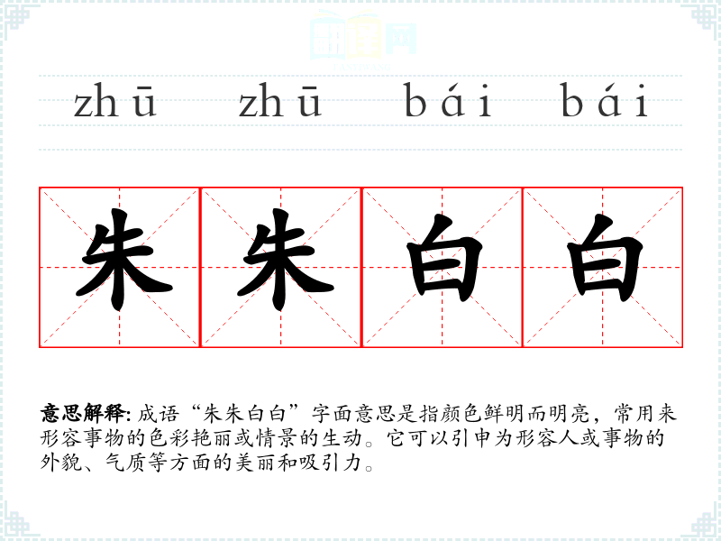 成语“朱朱白白”字面意思是指颜色鲜明而明亮,常用来形容事物的色彩艳丽或情景的生动。它可以引申为形容人或事物的外貌、气质等方面的美丽和吸引力。