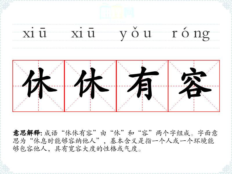 成语“休休有容”由“休”和“容”两个字组成。字面意思为“休息时能够容纳他人”,基本含义是指一个人或一个环境能够包容他人,具有宽容大度的性格或气度。
