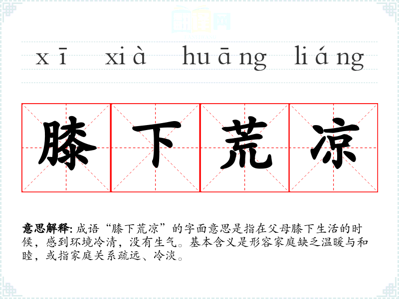 成语“膝下荒凉”的字面意思是指在父母膝下生活的时候,感到环境冷清,没有生气。基本含义是形容家庭缺乏温暖与和睦,或指家庭关系疏远、冷淡。