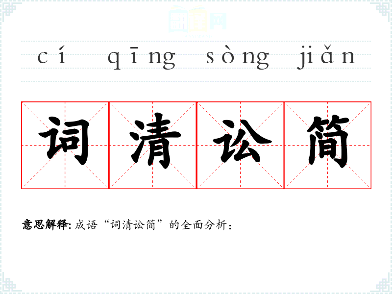 “词清讼简”字面意思是“词句清晰,诉讼简单”。它的基本含义是指言辞表达清楚,诉讼过程简单明了。这个成语强调了沟通的有效性和法律程序的简便性,通常用于形容在法律或者争议处理中,双方能够清楚地表达自己的观点和诉求。