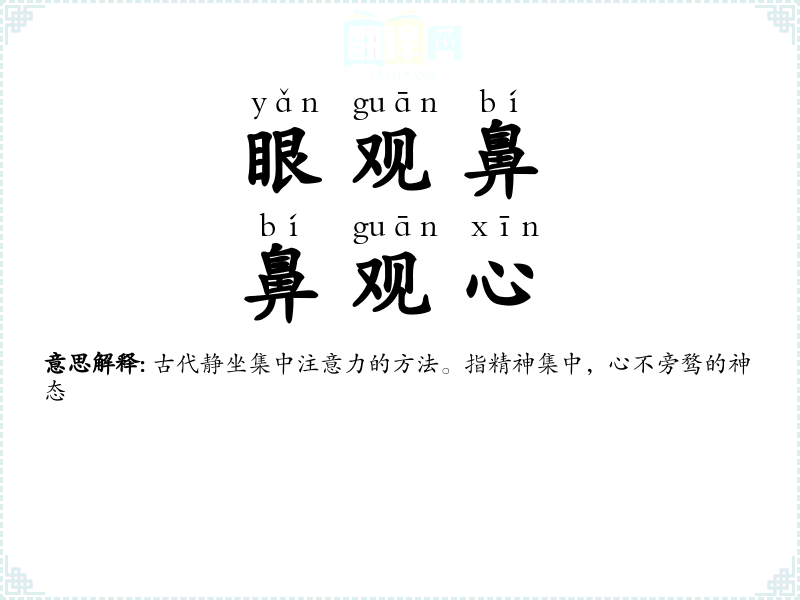 古代静坐集中注意力的方法。指精神集中,心不旁骛的神态