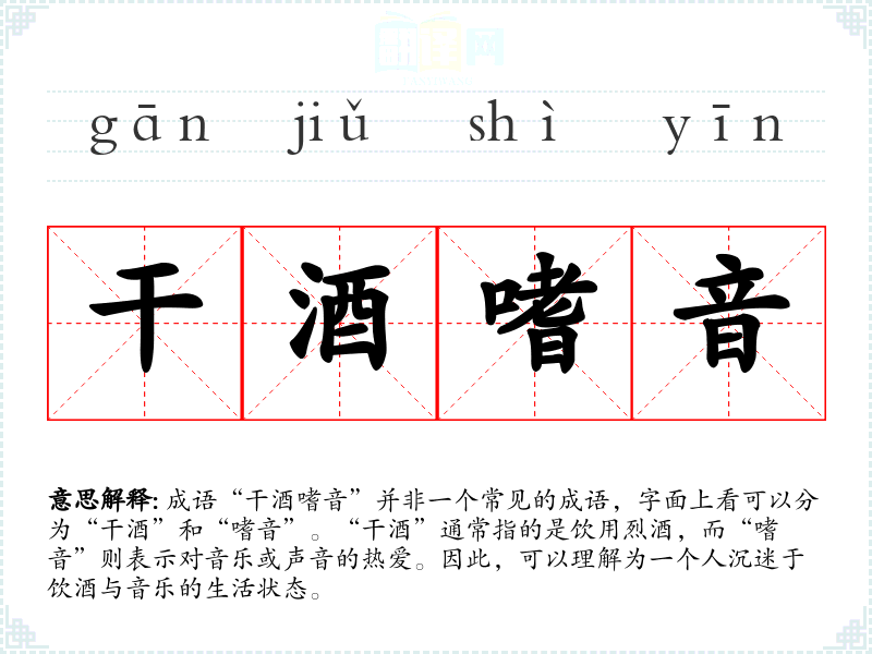 成语“干酒嗜音”并非一个常见的成语,字面上看可以分为“干酒”和“嗜音”。“干酒”通常指的是饮用烈酒,而“嗜音”则表示对音乐或声音的热爱。因此,可以理解为一个人沉迷于饮酒与音乐的生活状态。
