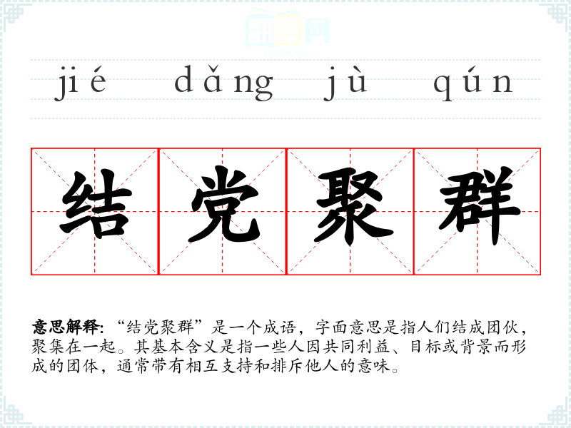 “结党聚群”是一个成语,字面意思是指人们结成团伙,聚集在一起。其基本含义是指一些人因共同利益、目标或背景而形成的团体,通常带有相互支持和排斥他人的意味。