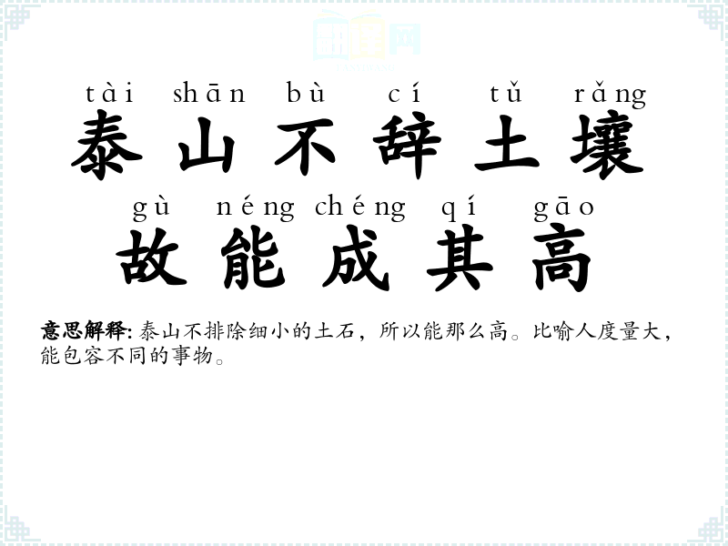 泰山不排除细小的土石,所以能那么高。比喻人度量大,能包容不同的事物。 |