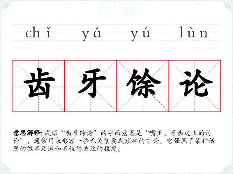 成语“齿牙馀论”的字面意思是“嘴里、牙齿边上的讨论”,通常用来形容一些无关紧要或琐碎的言论。它强调了某种话题的微不足道和不值得关注的程度。