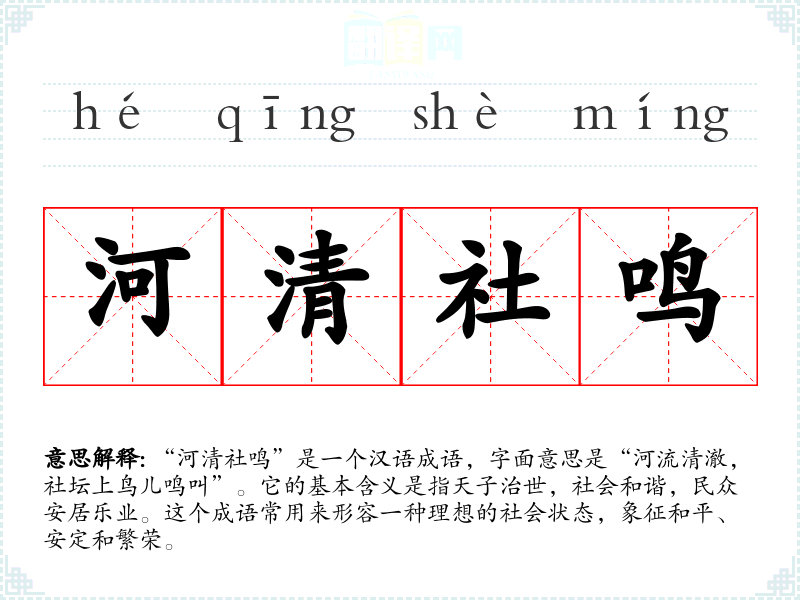 “河清社鸣”是一个汉语成语,字面意思是“河流清澈,社坛上鸟儿鸣叫”。它的基本含义是指天子治世,社会和谐,民众安居乐业。这个成语常用来形容一种理想的社会状态,象征和平、安定和繁荣。