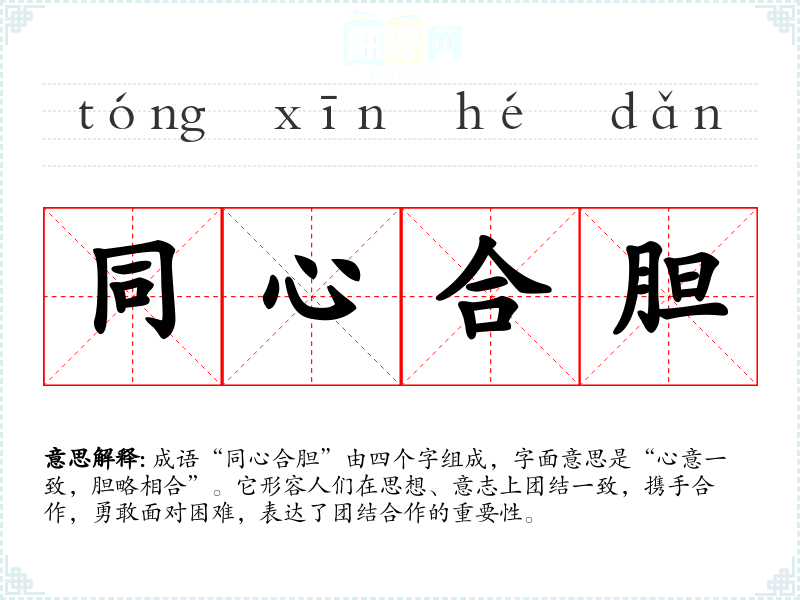 “同心合胆”出自《史记·平原君赵无恤传》,其中提到“同心合胆,言不相欺”。它强调了团结合作的力量,特别是在面对外部压力或挑战时,团结的力量能够克服困难。