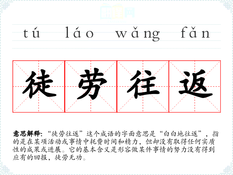 “徒劳往返”这个成语的字面意思是“白白地往返”,指的是在某项活动或事情中耗费时间和精力,但却没有取得任何实质性的成果或进展。它的基本含义是形容做某件事情的努力没有得到应有的回报,徒劳无功。