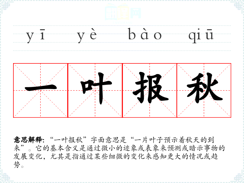 “一叶报秋”字面意思是“一片叶子预示着秋天的到来”。它的基本含义是通过微小的迹象或表象来预测或暗示事物的发展变化,尤其是指通过某些细微的变化来感知更大的情况或趋势。