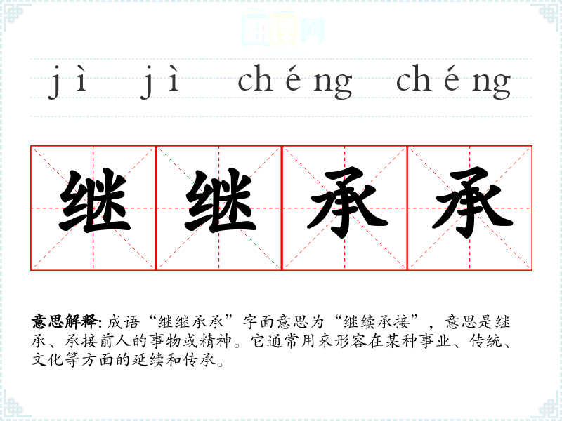 成语“继继承承”字面意思为“继续承接”,意思是继承、承接前人的事物或精神。它通常用来形容在某种事业、传统、文化等方面的延续和传承。