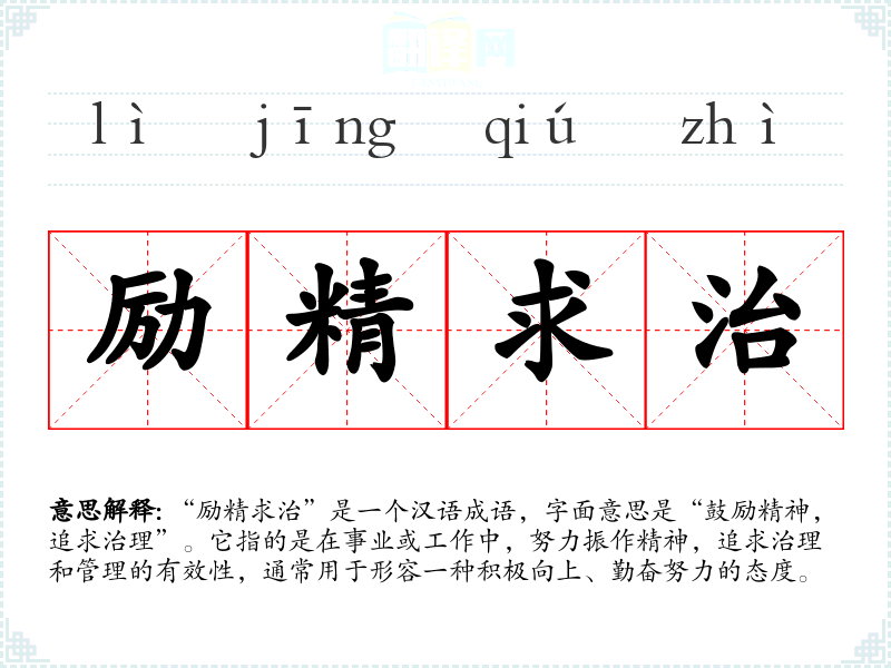 “励精求治”是一个汉语成语,字面意思是“鼓励精神,追求治理”。它指的是在事业或工作中,努力振作精神,追求治理和管理的有效性,通常用于形容一种积极向上、勤奋努力的态度。