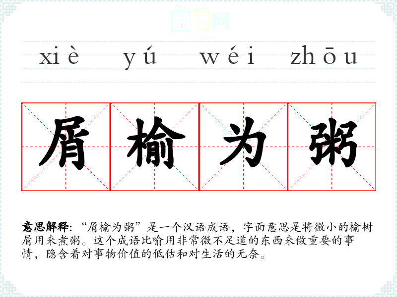 - 反义成语:一丝不苟、尽善尽美。它们强调对事物的重视和追求完美,体现了与“屑榆为粥”相对的态度。