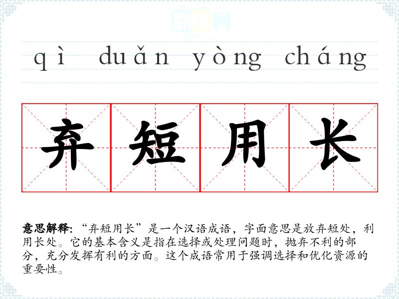 “弃短用长”并没有明确的历史典故,但其理念可以追溯到古代哲学家的思想,如《论语》中提到的因材施教、取长补短的观点。成语的构成反映了古人对智慧和策略的重视,强调在复杂的情况下应当做出理智的选择。