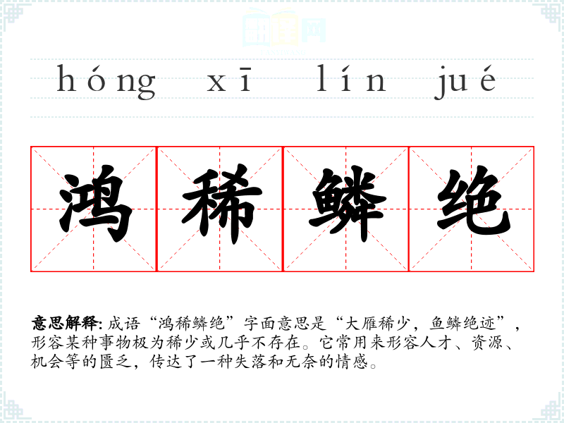 成语“鸿稀鳞绝”字面意思是“大雁稀少,鱼鳞绝迹”,形容某种事物极为稀少或几乎不存在。它常用来形容人才、资源、机会等的匮乏,传达了一种失落和无奈的情感。