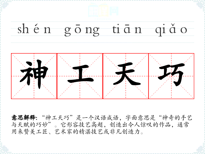 “神工天巧”是一个汉语成语,字面意思是“神奇的手艺与天赋的巧妙”。它形容技艺高超,创造出令人惊叹的作品,通常用来赞美工匠、艺术家的精湛技艺或非凡创造力。
