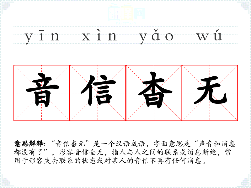 “音信杳无”是一个汉语成语,字面意思是“声音和消息都没有了”,形容音信全无,指人与人之间的联系或消息断绝,常用于形容失去联系的状态或对某人的音信不再有任何消息。