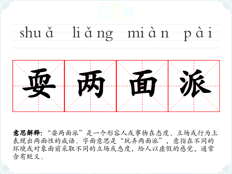 “耍两面派”是一个形容人或事物在态度、立场或行为上表现出两面性的成语。字面意思是“玩弄两面派”,意指在不同的环境或对象面前采取不同的立场或态度,给人以虚假的感觉,通常含有贬义。