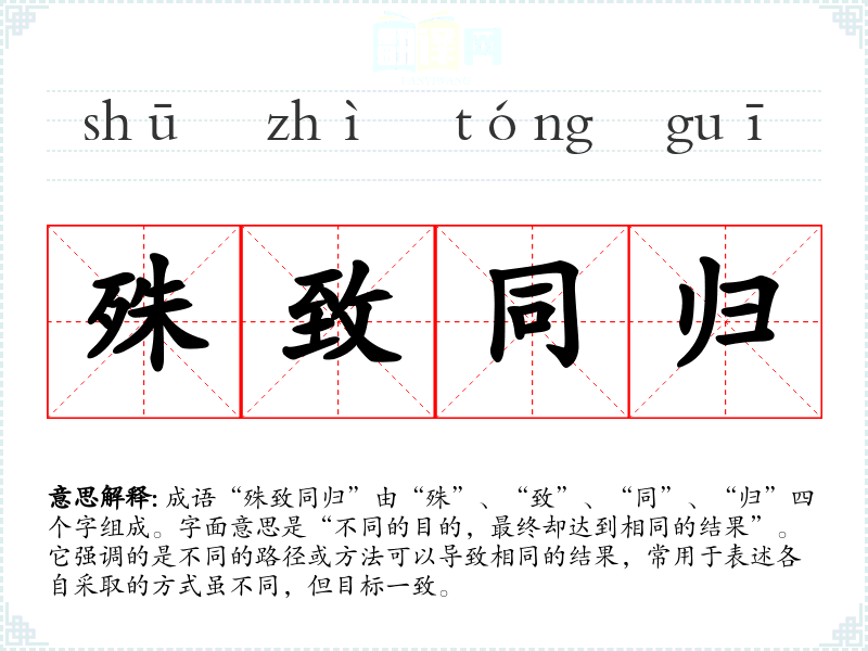 成语“殊致同归”由“殊”、“致”、“同”、“归”四个字组成。字面意思是“不同的目的,最终却达到相同的结果”。它强调的是不同的路径或方法可以导致相同的结果,常用于表述各自采取的方式虽不同,但目标一致。