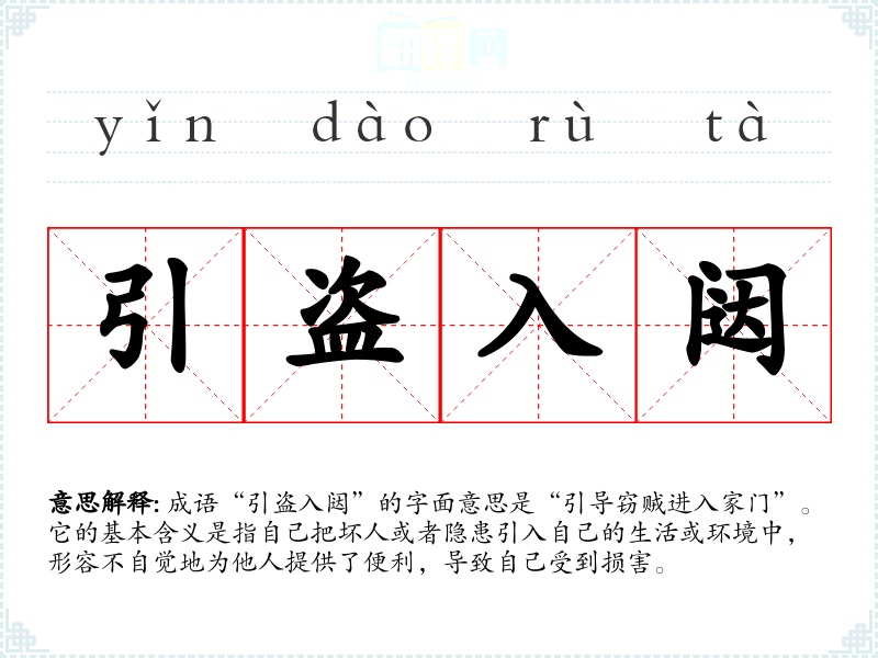 成语“引盗入闼”的字面意思是“引导窃贼进入家门”。它的基本含义是指自己把坏人或者隐患引入自己的生活或环境中,形容不自觉地为他人提供了便利,导致自己受到损害。