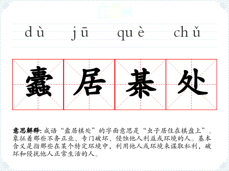 成语“蠹居棋处”的字面意思是“虫子居住在棋盘上”。象征着那些不务正业、专门破坏、侵蚀他人利益或环境的人。基本含义是指那些在某个特定环境中,利用他人或环境来谋取私利,破坏和侵扰他人正常生活的人。