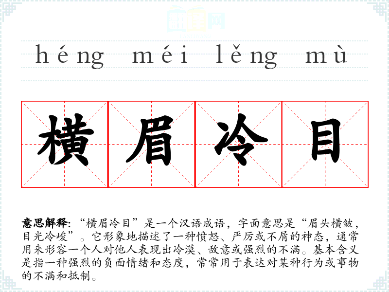“横眉冷目”是一个汉语成语,字面意思是“眉头横皱,目光冷峻”。它形象地描述了一种愤怒、严厉或不屑的神态,通常用来形容一个人对他人表现出冷漠、敌意或强烈的不满。基本含义是指一种强烈的负面情绪和态度,常常用于表达对某种行为或事物的不满和抵制。