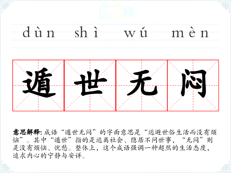 成语“遁世无闷”的字面意思是“逃避世俗生活而没有烦恼”。其中“遁世”指的是逃离社会、隐居不问世事,“无闷”则是没有烦恼、忧愁。整体上,这个成语强调一种超然的生活态度,追求内心的宁静与安详。