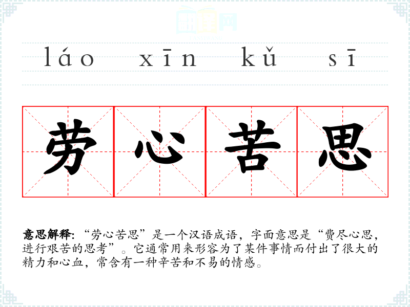 “劳心苦思”是一个汉语成语,字面意思是“费尽心思,进行艰苦的思考”。它通常用来形容为了某件事情而付出了很大的精力和心血,常含有一种辛苦和不易的情感。