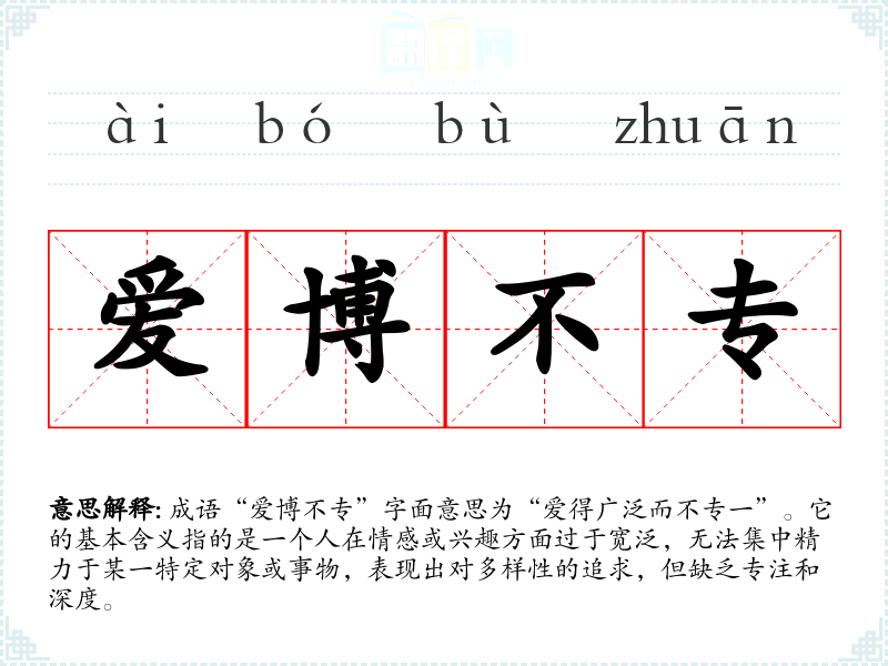 成语“爱博不专”字面意思为“爱得广泛而不专一”。它的基本含义指的是一个人在情感或兴趣方面过于宽泛,无法集中精力于某一特定对象或事物,表现出对多样性的追求,但缺乏专注和深度。