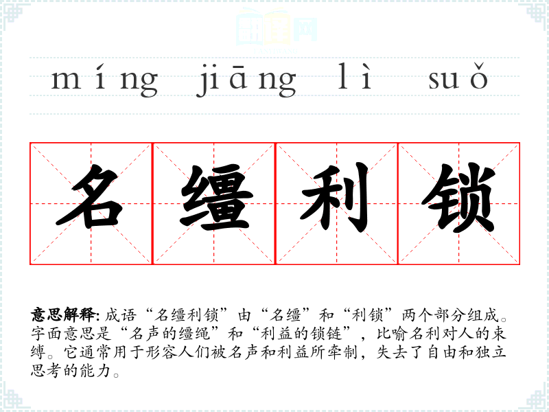 | 利缰名锁 | 缰:缰绳。锁:锁链。名和利像缰绳和锁链一样把人束缚住了。 |