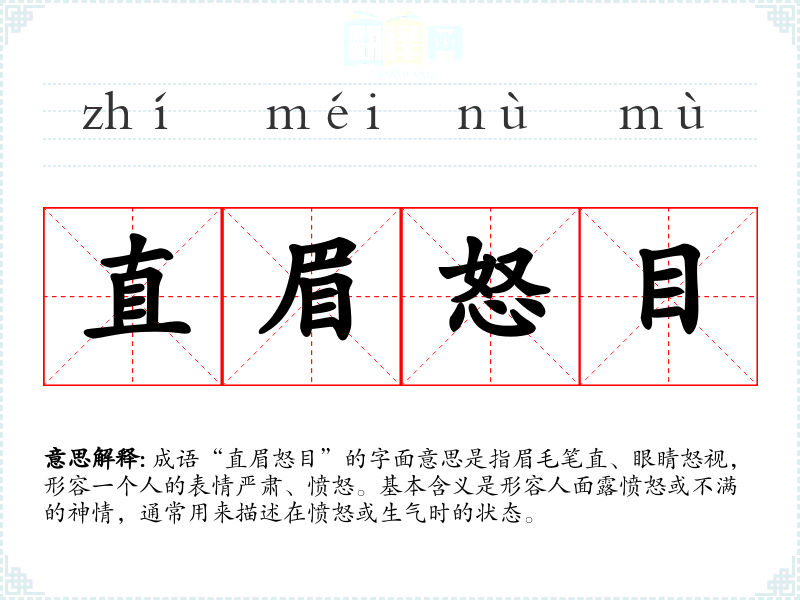 成语“直眉怒目”的字面意思是指眉毛笔直、眼睛怒视,形容一个人的表情严肃、愤怒。基本含义是形容人面露愤怒或不满的神情,通常用来描述在愤怒或生气时的状态。