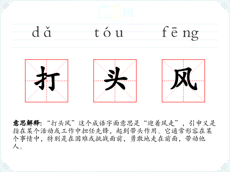 “打头风”这个成语字面意思是“迎着风走”,引申义是指在某个活动或工作中担任先锋,起到带头作用。它通常形容在某个事情中,特别是在困难或挑战面前,勇敢地走在前面,带动他人。