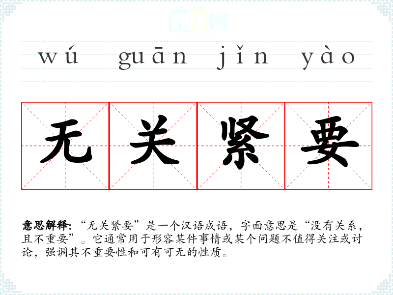 “无关紧要”是一个汉语成语,字面意思是“没有关系,且不重要”。它通常用于形容某件事情或某个问题不值得关注或讨论,强调其不重要性和可有可无的性质。
