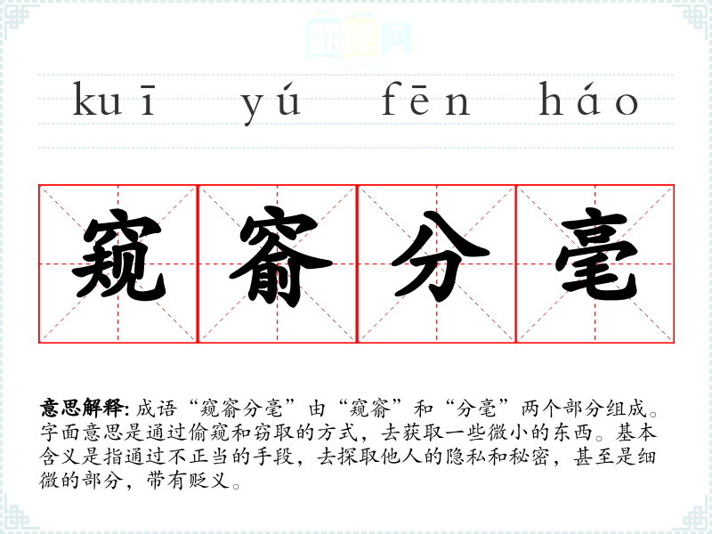 成语“窥窬分毫”由“窥窬”和“分毫”两个部分组成。字面意思是通过偷窥和窃取的方式,去获取一些微小的东西。基本含义是指通过不正当的手段,去探取他人的隐私和秘密,甚至是细微的部分,带有贬义。