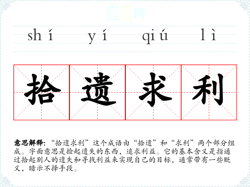 “拾遗求利”这个成语由“拾遗”和“求利”两个部分组成。字面意思是捡起遗失的东西,追求利益。它的基本含义是指通过拾起别人的遗失和寻找利益来实现自己的目标,通常带有一些贬义,暗示不择手段。